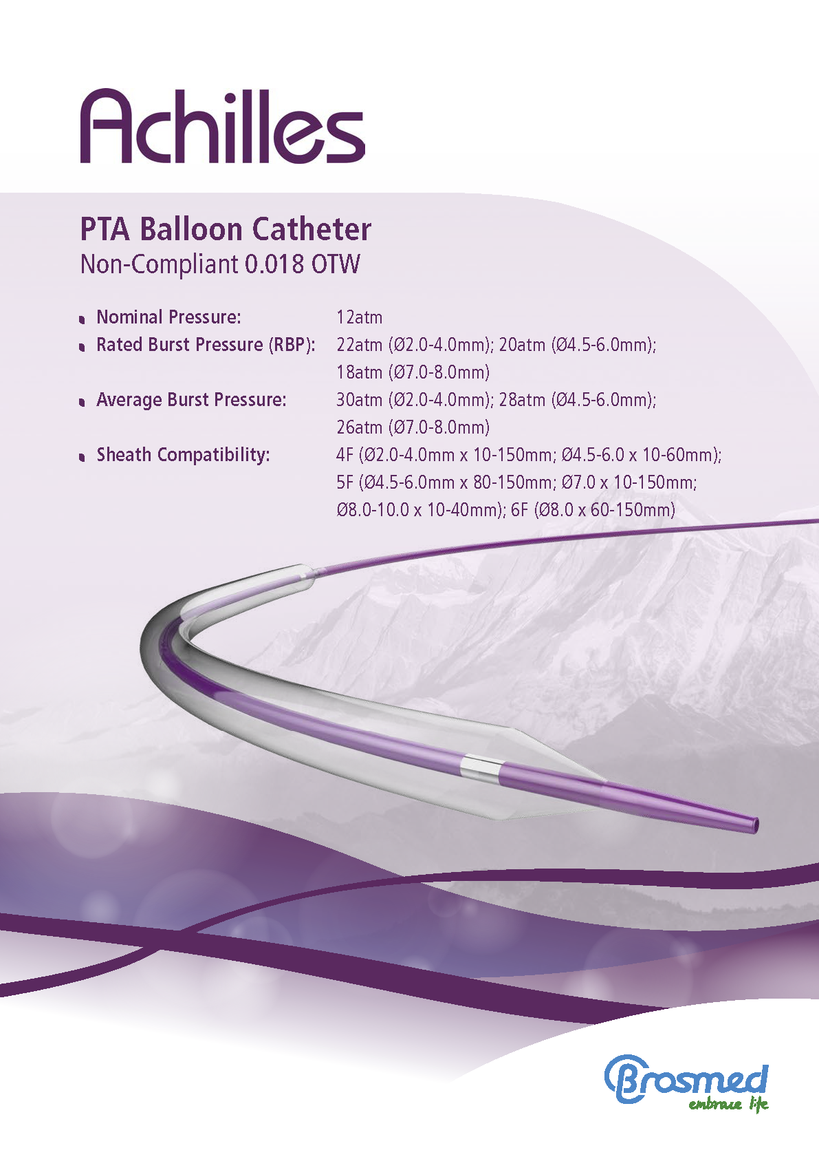 Achilles™ NC — это нерастяжимый (non-compliant) over-the-wire баллонный катетер диаметром 0.018″, разработанный для предельно точной дилатации периферических и ниже-коленных сосудов. Номинальное рабочее давление — 12 атм, расчётное разрывное давление достигает 22 атм для баллонов 3–4 мм и 20 атм для 4,5–6 мм; средние разрывные давления составляют 30 атм и 28 атм соответственно. Совместим с интродьюсерами 4 F (3–4 мм), 5 F (4,5–6 мм) и 6 F (7 мм), обеспечивая превосходную продвигаемость, устойчивость к перегибам и гидрофильное покрытие для легкого прохождения через узкие, кальцифицорованные и диффузные стенозы, гарантируя контролируемую дилатацию при минимальной травматизации сосудистой стенки.