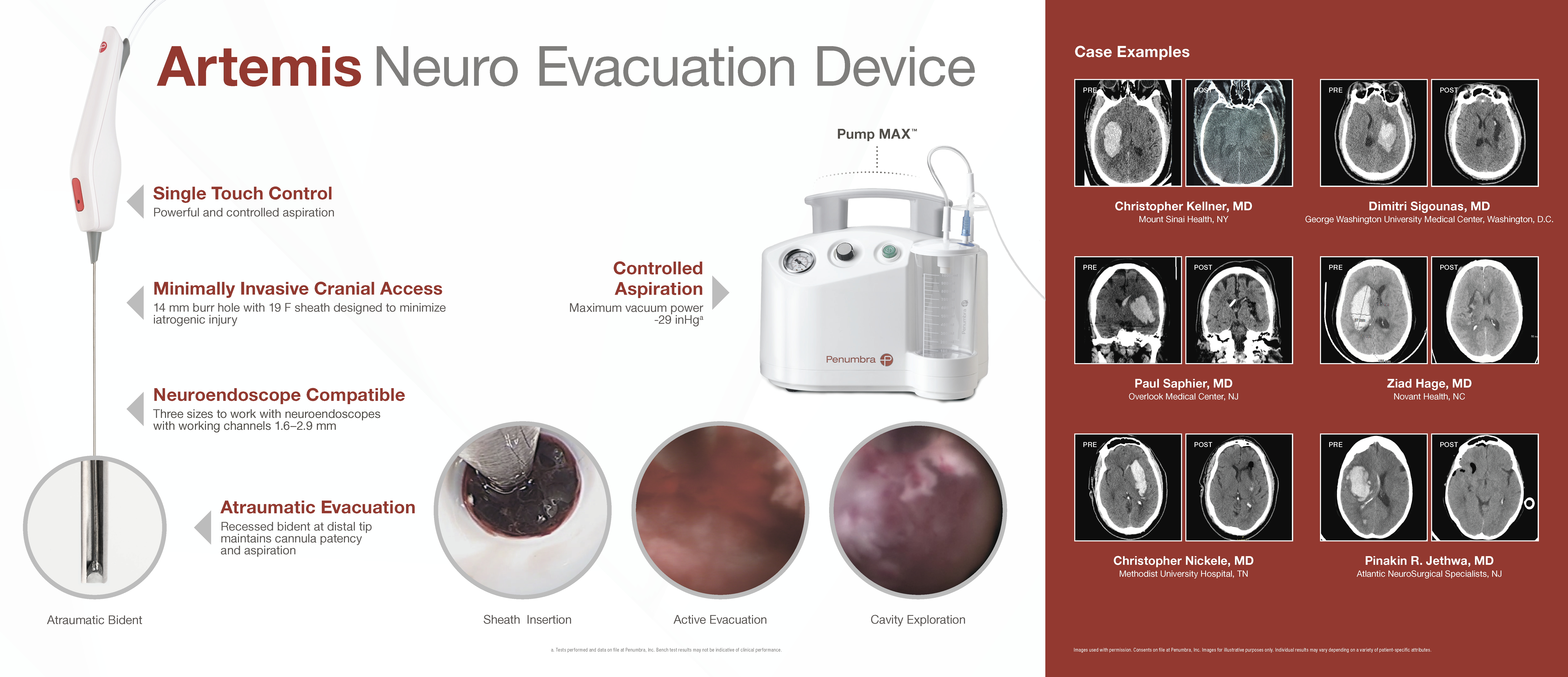 Устройство для эвакуации Artemis ™ Neuro предназначено для контролируемой аспирации ткани и / или жидкости из желудочков и других структур головного мозга. Устройство Artemis работает в сочетании с нейроэндоскопом через проводник 19 F (6 мм). Вместе с аспирационной системой Pump MAX ™ Artemis обеспечивает мощную и контролируемую эвакуацию гематомы при минимальном инвазивном вмешательстве.